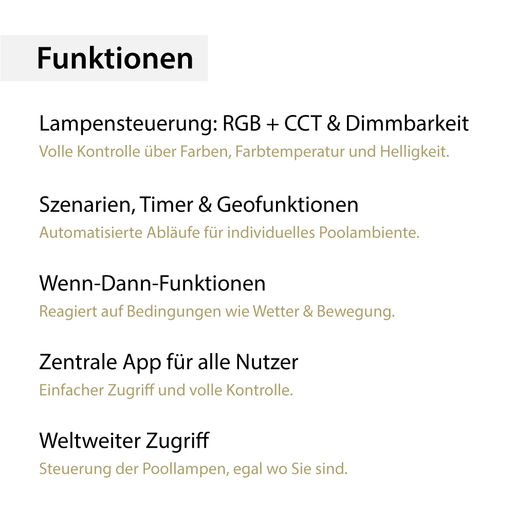 Komfortable Steuerung von überallSteuern Sie Ihre Poollampen bequem über die jeweilige App Ihres Smart Home-Systems. Damit können Sie jede Lampe individuell ein- und ausschalten, dimmen oder die Farben ändern – ganz ohne zusätzliche DMX-Steuerung. Mit intelligenten Funktionen wie „Wenn-Dann“-Formeln, Geo-Fencing und Timer-Einstellungen stehen Ihnen zahlreiche Möglichkeiten zur Verfügung, um Ihren Pool perfekt in Szene zu setzen.