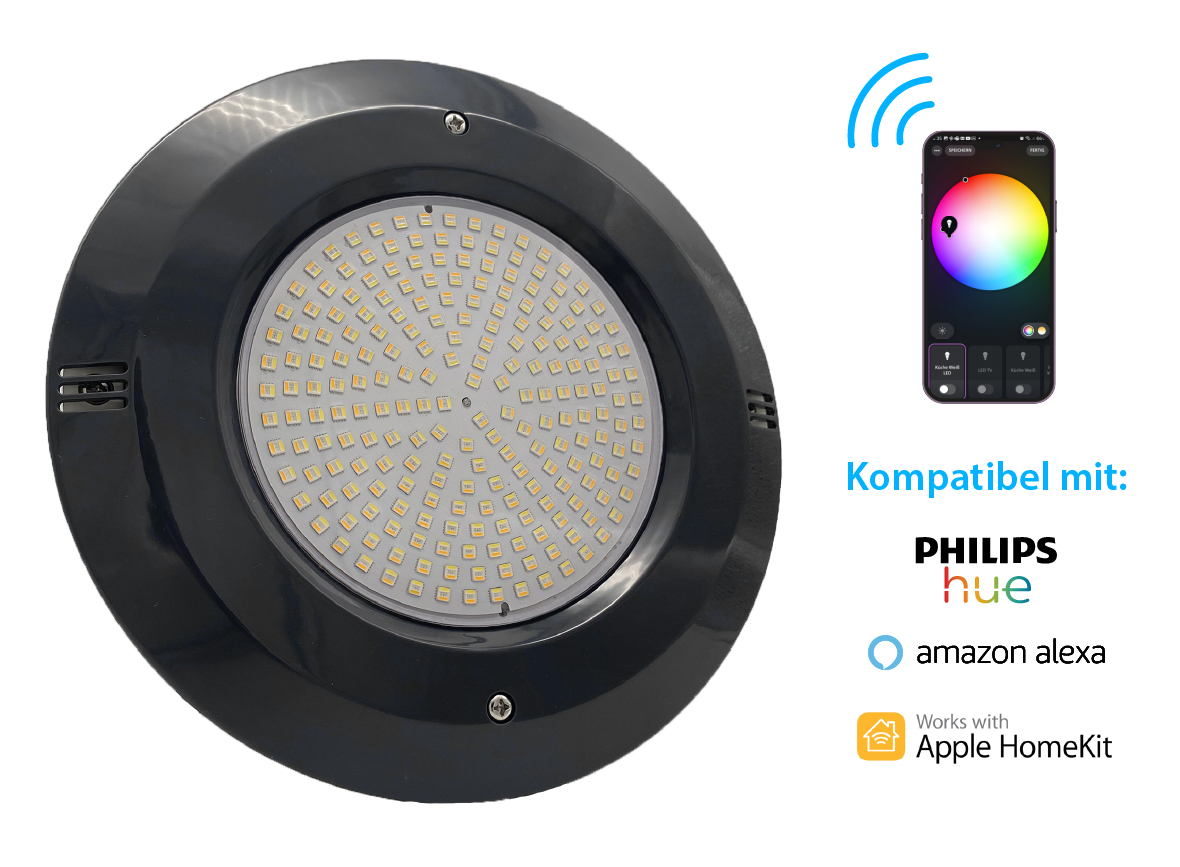 Kompatible Philips Hue Smart Home Unterwasserscheinwerfer LED Licht Set  Leuchte  Blende grauEin innovatives Licht für deinen PoolVerwandle deinen Pool in eine Lichtoase mit unseren kompatiblen Philips Hue Smart Home Unterwasserscheinwerfern. Das LED Licht Set ist die neueste Generation an smarter Poolbeleuchtung und bietet dir vielfältige Möglichkeiten, die Atmosphäre rund um deinen Pool zu gestalten. Egal, ob du entspannende Abende oder lebhafte Partys planst, unsere Poollampen passen sich deinen Bedürfnissen an.Wichtige Merkmale und technische DatenSmarte Poollampen mit CCT-TechnologieUnsere neuesten Smart Home Poollampen nutzen fortschrittliche LED-Technologie und die innovative CCT-Funktion (Correlated Color Temperature). Damit kannst du die Farbtemperatur von warmweiß bis kaltweiß einstellen und so die Lichtstimmung gezielt steuern.Flexibilität in der Lichtgestaltung RGB und Dimmbarkeit: Wähle aus Millionen von Farben und passe die Helligkeit von 0 % bis 100 % an. ZigBee-Kompatibilität: Verbindung zu beliebten Smart Home Systemen wie Philips Hue, Amazon Alexa und Google Home. Technische Details Modell: PF355BD2 Leistung: 36W Spannung: DC 12V LED LED Anzahl: 216 Stück Lichtleistung: 100 lm/W Material: PC + Harzfüllung, vollständig wasserdicht Wasserdichtigkeit: IP68 Salzwasserbeständigkeit: Bis zu 0,5 % Montage: Direkt an der Blende Faszination durch innovative TechnikDank der CCT-Technologie in Kombination mit RGB und Dimmbarkeit bieten unsere Poollampen nicht nur eine beeindruckende Lichtqualität, sondern auch eine unendliche Anzahl an Gestaltungsmöglichkeiten für deinen Poolbereich. Du kannst die Farbtemperatur für verschiedene Anlässe mühelos anpassen – von warmen, einladenden Tönen bis hin zu erfrischendem, kühlem Licht.Die einfache Steuerung über ZigBee ermöglicht dir, deine Poollampen auch bequem von unterwegs aus zu bedienen. Mit der zugehörigen App kannst du nicht nur die Farben wechseln und dimmen, sondern auch Zeitpläne erstellen oder Geofencing nutzen, um eine personalisierte Poolbeleuchtung zu gewährleisten.Die Installation ist ebenfalls unkompliziert. Dank wasserdichtem Design und standardisiertem PAR56-Einbautopf wird die Montage zum Kinderspiel.Lieferumfang1x PAR56 Universal Pool Gehäuse mit grauer Blende1x Flanschsatz1x LED-Unterwasserscheinwerfer (36 Watt, RGB CCT) inkl. 2 Meter langem Kabel - IP681x Kabelschutzschlauch (1 Meter)1x Verbindungsdose IP661x Verteilerblock1x Steuergerät IP681x Transformator1x Zubehörteile (Schrauben, Dichtungen)1x Philips Hue Bridge (optional) Gestalte deinen Pool mit unseren kompatiblen Philips Hue Smart Home Unterwasserscheinwerfern und genieße die unzähligen Möglichkeiten! Jetzt kaufen und deine Poolbeleuchtung auf ein neues Level bringen!