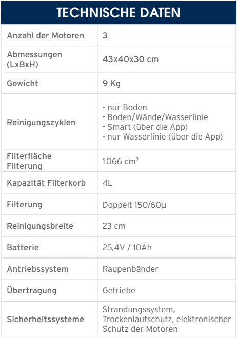 Die patentierte Zyklontechnologie garantiert eine kraftvolle und langlebige Reinigung. Die Helix-Rotationsbürsten lösen selbst hartnäckigen Schmutz, während die große Ansaugöffnung und die zweistufige Filtration auch feinste Verschmutzungen zuverlässig aufnehmen. Intelligente Sensoren navigieren den Roboter präzise durch dein Schwimmbecken und sorgen für eine vollständige Abdeckung – egal ob rund, oval oder rechteckig.