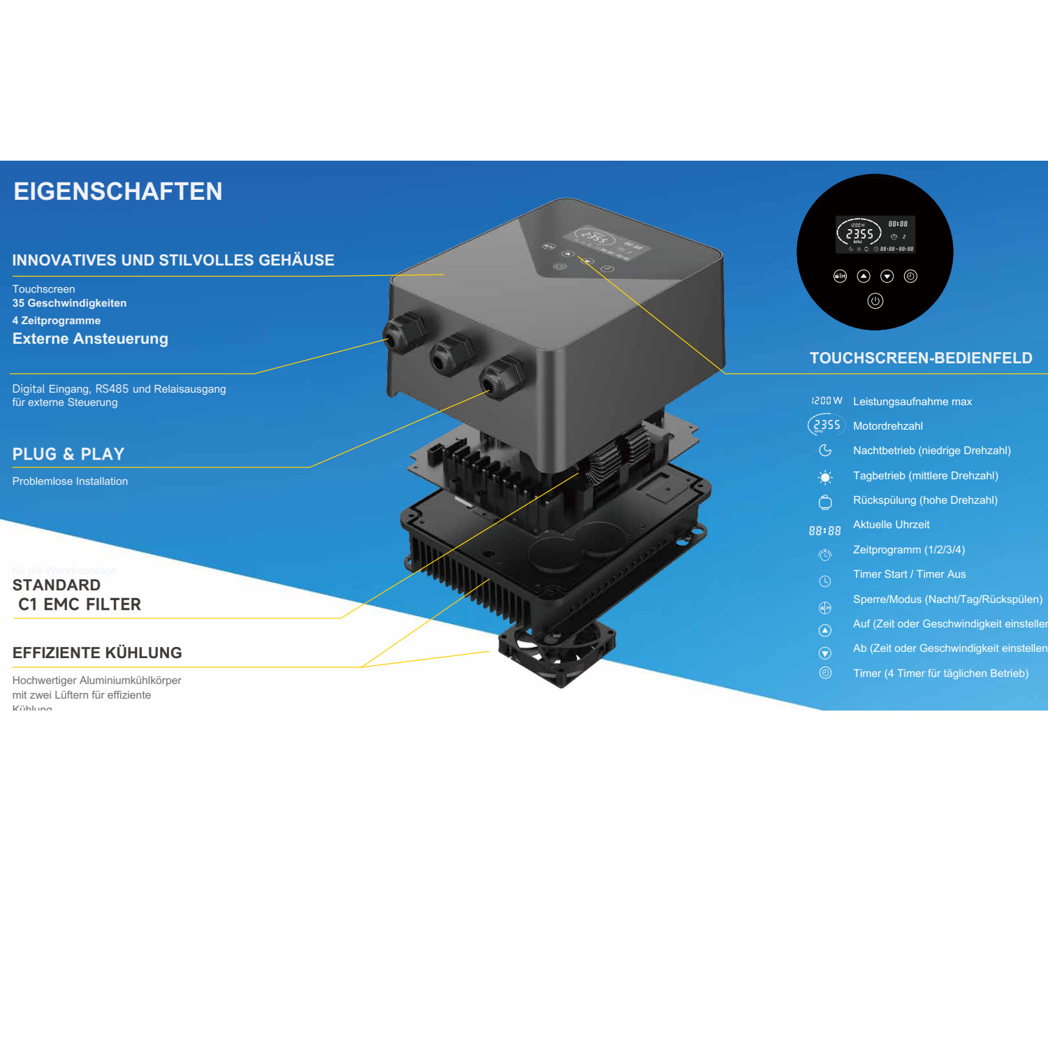 - 4 frei konfigurierbare 24‑h‑Timer (verschiedene Geschwindigkeiten)