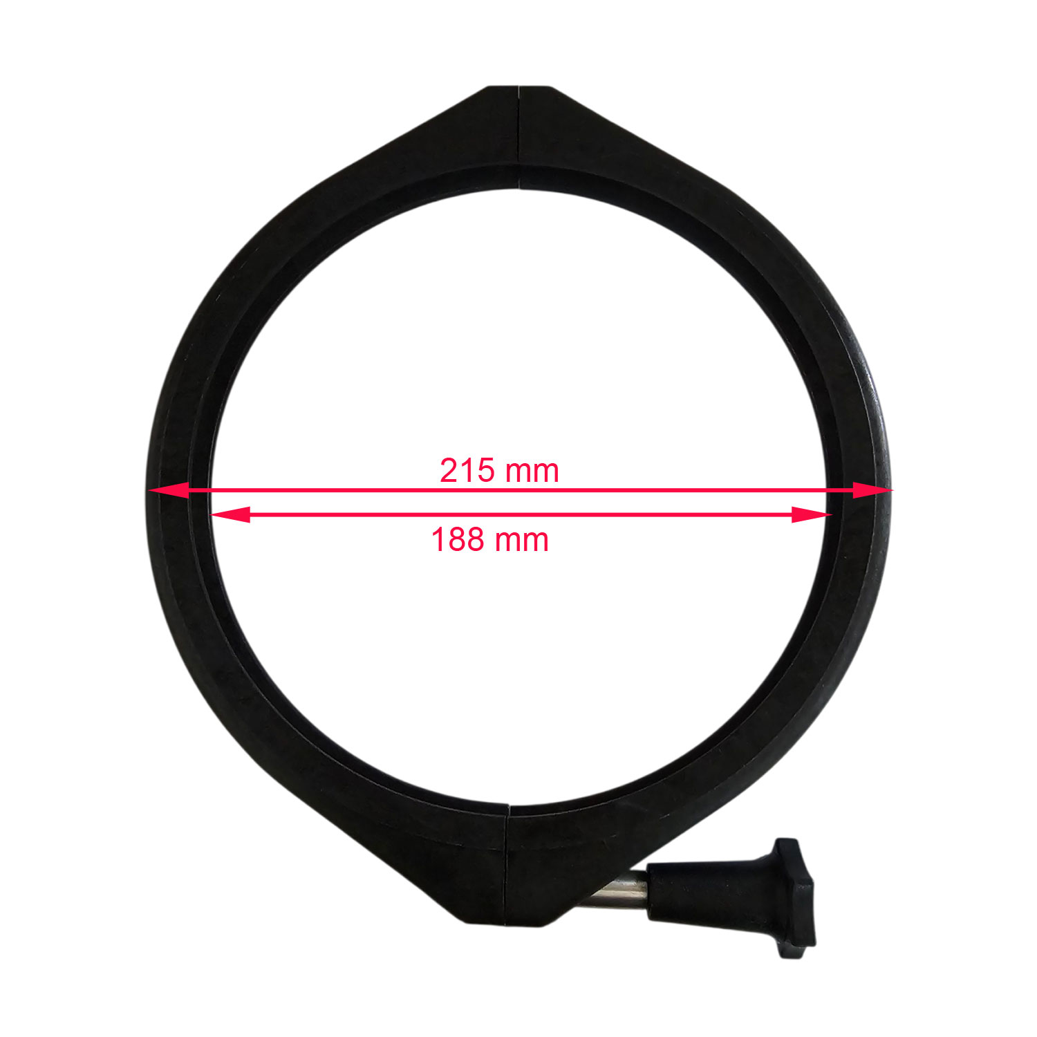Das Set beinhaltet einen Klemmring mit den Maßen 215 mm Außendurchmesser, 188 mm Innendurchmesser und 22 mm Stärke. Zusätzlich sind ein passender O-Ring sowie die erforderlichen Befestigungsschrauben im Lieferumfang enthalten.