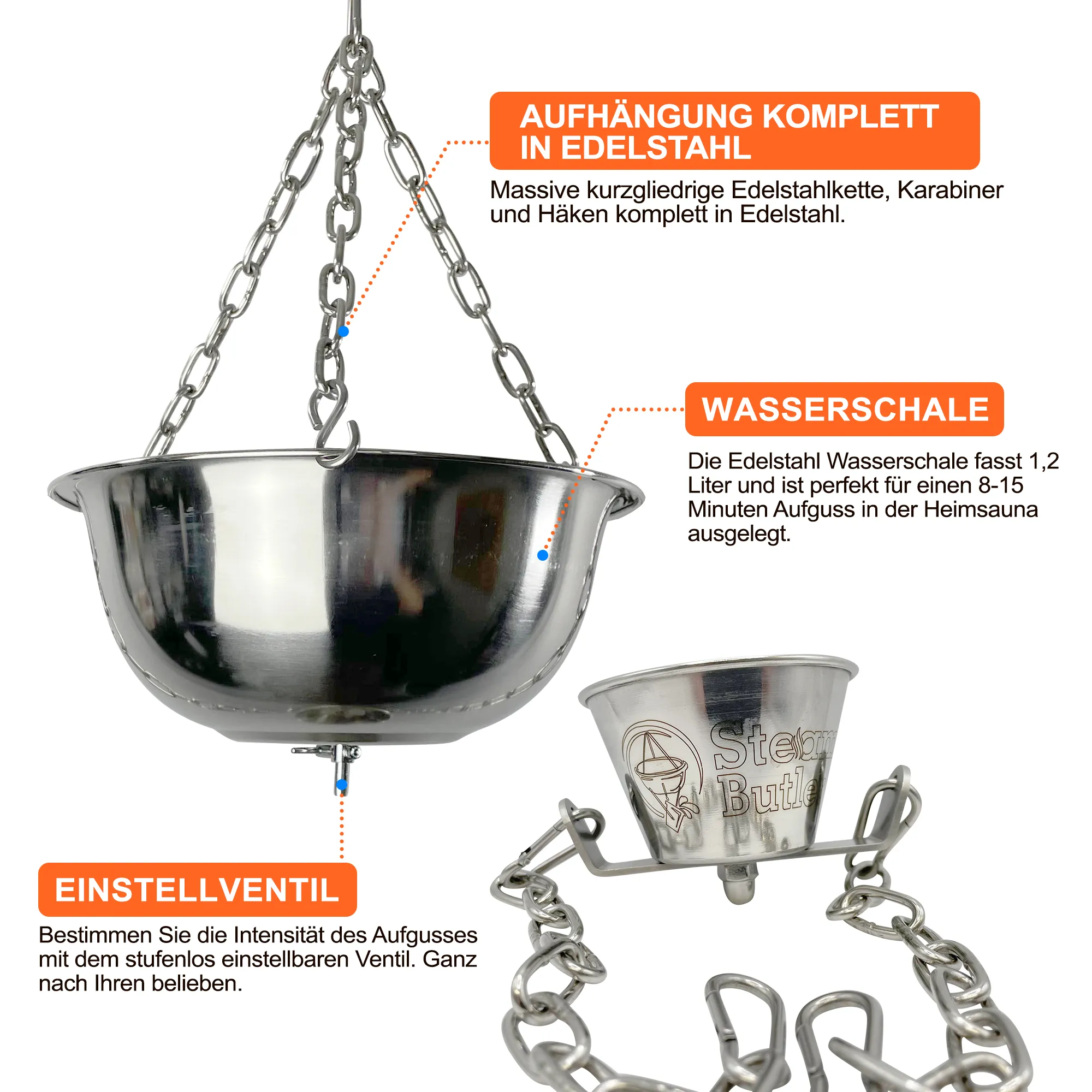 Genieße perfekte Aufgüsse ohne Aufwand! Der Steam Butler Home macht dein Saunaerlebnis komfortabel, indem er für dich regelmäßig Wasser auf die heißen Steine gießt. Einfach Wasser einfüllen, Ventil einstellen, zurücklehnen und die wohltuende Dampfwirkung genießen. Dieses innovative Automatiksystem ist ideal für private Saunen und sorgt für eine stets gleichmäßige und angenehme Luftfeuchtigkeit.