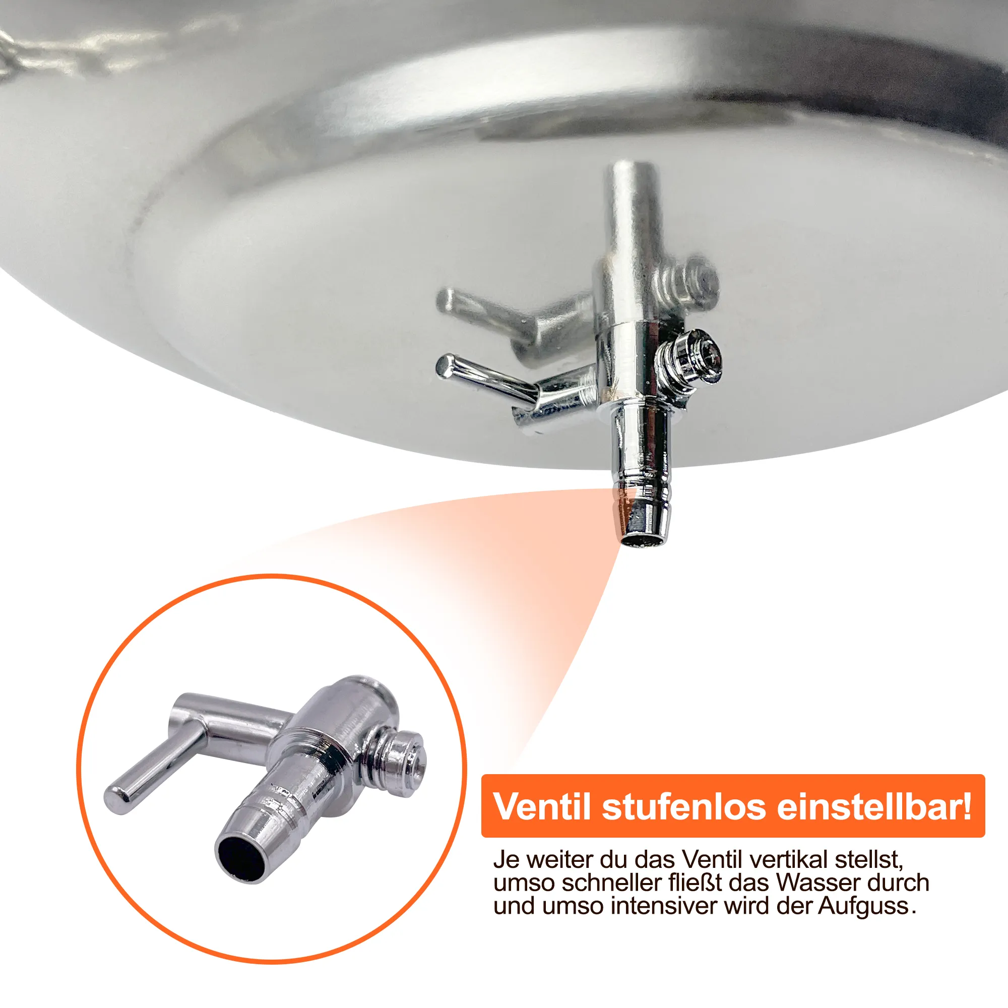 - Aufguss-Dauer: Bei maximal geöffnetem Ventil ca. 7 Minuten (etwa 17 automatische Aufgüsse)