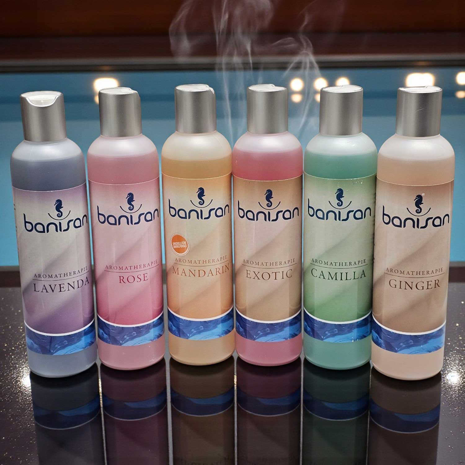 Erlebe pure Entspannung und spüre, wie Stress und Hektik von Dir abfallen! Banisan bringt Dir mit Lavenda einen beruhigenden Begleiter, während Camilla bei intensiver Erholung unterstützt. Der Duft Ginger vitalisiert neue Energie in Dir, während Mandarin mit warmen, fruchtigen Aromen für Harmonie sorgt. Exotic füllt Deinen Badetag mit Sommer-Vibes und die Rose-Duftnote hüllt Dich in eine magische Welt. Dank der nicht schäumenden Formel bleibt Dein Whirlpool stets sauber – und Du pflegst zugleich Deine Haut!