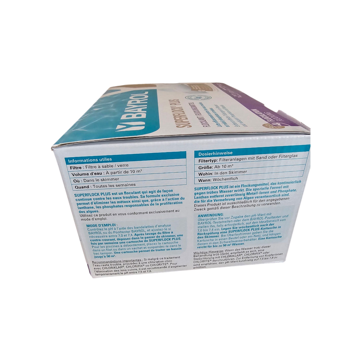Bayrol Superflock Plus ist ein Flockmittel in Kartuschenform, das speziell für die Wasserpflege von Schwimmbädern entwickelt wurde. Es bindet feinste Schmutzpartikel, die vom Filtersystem nicht erfasst werden, und sorgt so für kristallklares Wasser.