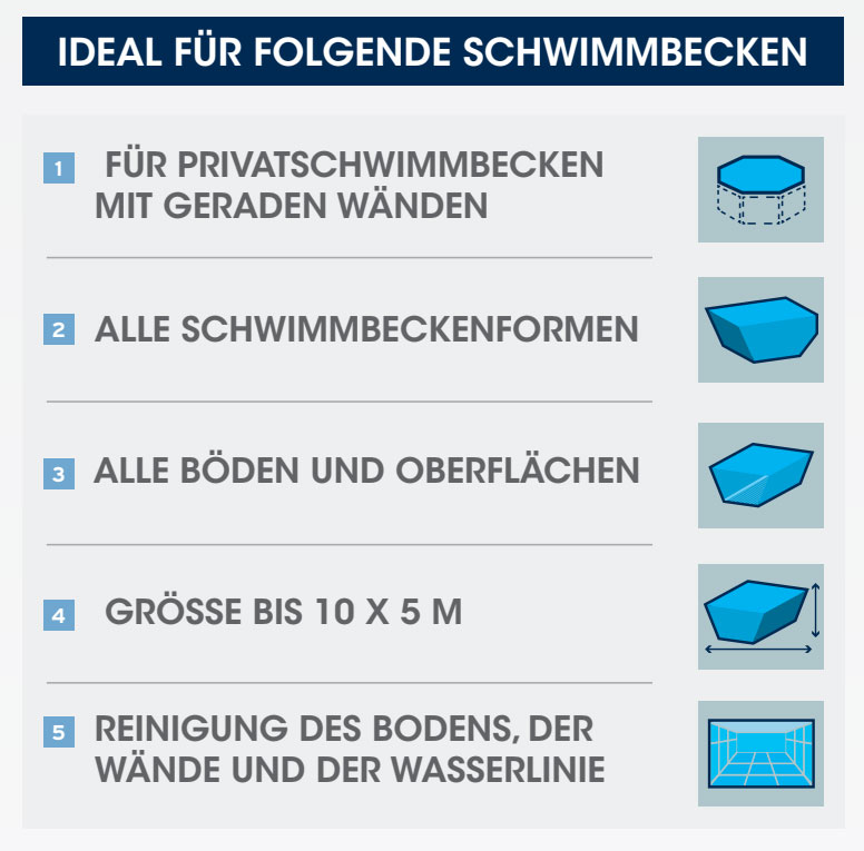 - Einsatzbereich: Privatschwimmbecken bis max. 10 x 5 m mit geraden Wänden