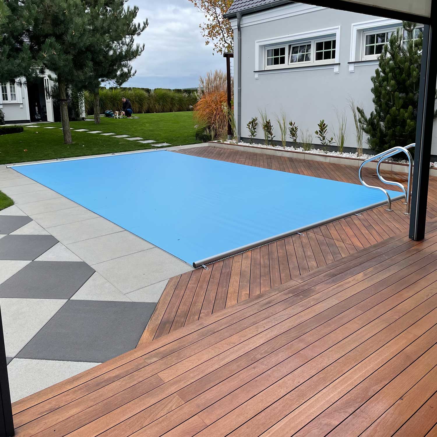 So passt du deine Poolabdeckung optisch an Haus, Terrasse und Garten an – von dezent und elegant bis hin zu klassisch blau. Die kompakten Außenabmessungen und der flache Aufbau machen die Abdeckung besonders attraktiv für moderne Poolanlagen mit schmalen Beckenrändern.