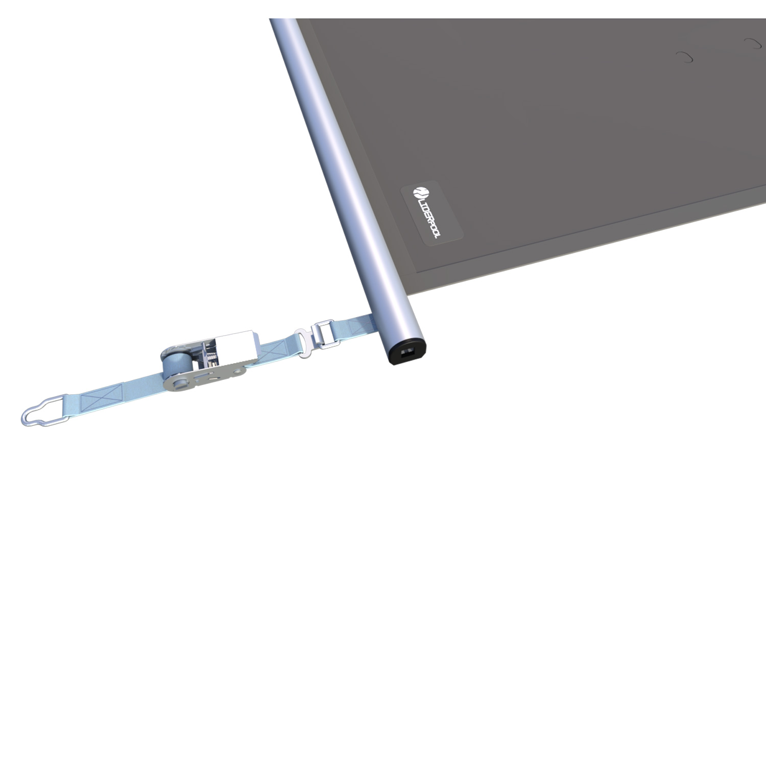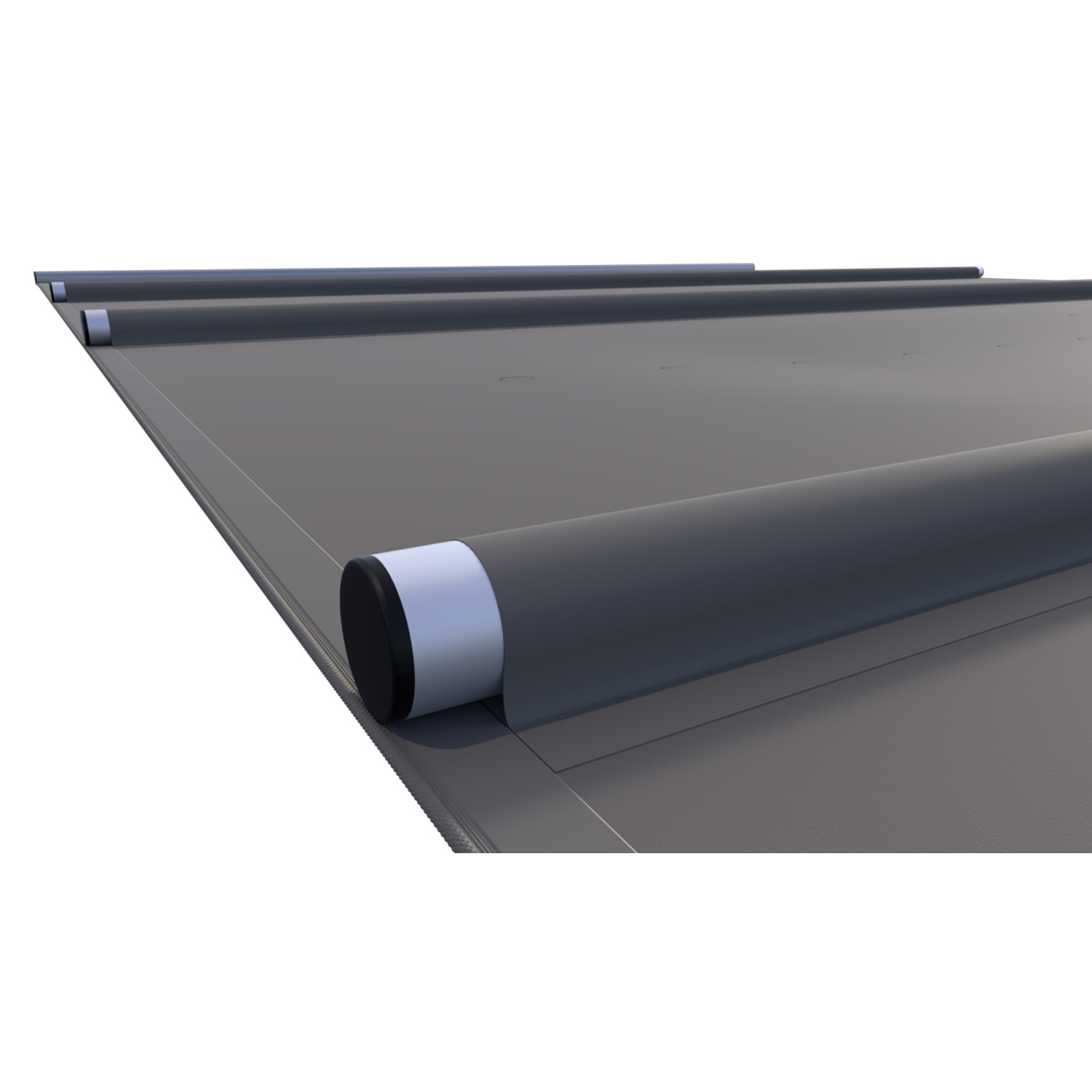 Bei der Variante Rollschutz „Tube“ liegen die inneren Trägerrohre über die gesamte Breite oberhalb der Plane und sind in einer Lasche aus PVC-Plane eingeschweißt. Auf der Unterseite schützen zusätzlich angebrachte Kunststoffleisten den Beckenrand. Ideal bei total ebenen Auflageflächen .