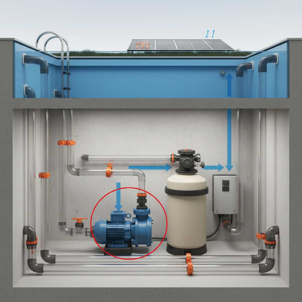 Die Pumpe sitzt also zwischen Skimmer/Bodenablauf und Filteranlage. Sie saugt Wasser aus dem Becken an, drückt es durch den Filter und weiter zu Heizung, Solaranlage oder direkt zurück in den Pool.