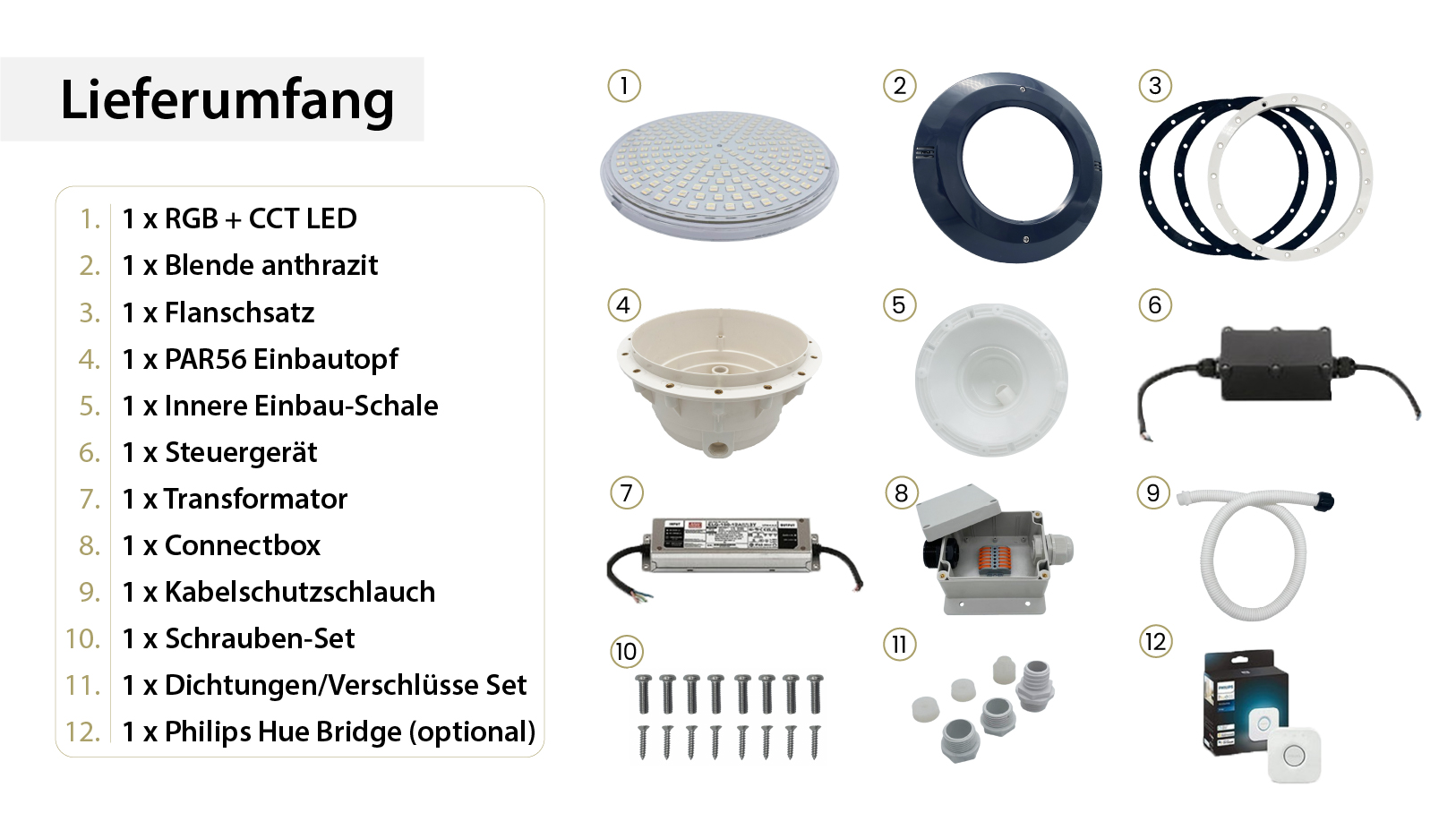 Noch kein Smart Home System? Wir empfehlen Philips Hue!Die Philips Hue Bridge ist das zentrale Steuerelement des Philips Hue Systems. Sie verbindet smarte Beleuchtung mit Ihrem Heimnetzwerk und ermöglicht die Steuerung über eine App. Mit Zigbee als Funkprotokoll stellt sie zuverlässige Kabelfreie Verbindungen zu den Poollampen her und erlaubt zudem die Integration und Steuerung von bis zu 50 unterschiedlichen Geräten sowie komplexer Automatisierungen und Szenarien. Die Philips Hue Bridge können Sie bei uns optional zusammen mit den Poollampen erwerben.