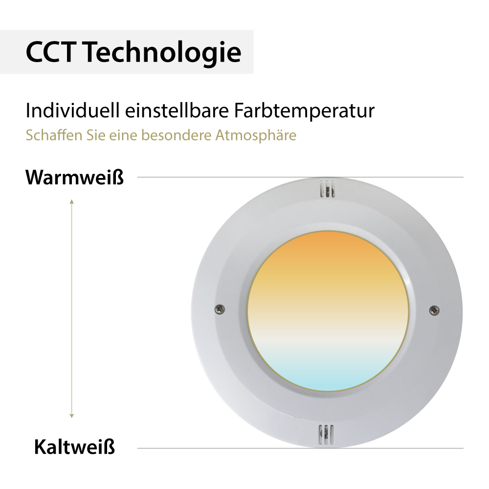 Innovative Poollampen mit CCT-TechnologieUnsere neuesten Smart Home Poollampen vereinen moderne LED-Technologie mit der fortschrittlichen CCT-Funktion (Correlated Color Temperature). Während ältere Modelle lediglich RGBW-Funktionen boten, eröffnet die neue CCT-Technologie völlig neue Möglichkeiten für Ihre Poolbeleuchtung. Mit CCT können Sie die Farbtemperatur von warmweiß bis kaltweiß anpassen und so die Lichtstimmung im Poolbereich präzise gestalten – ideal für entspannte Abende oder energiegeladene Partys.