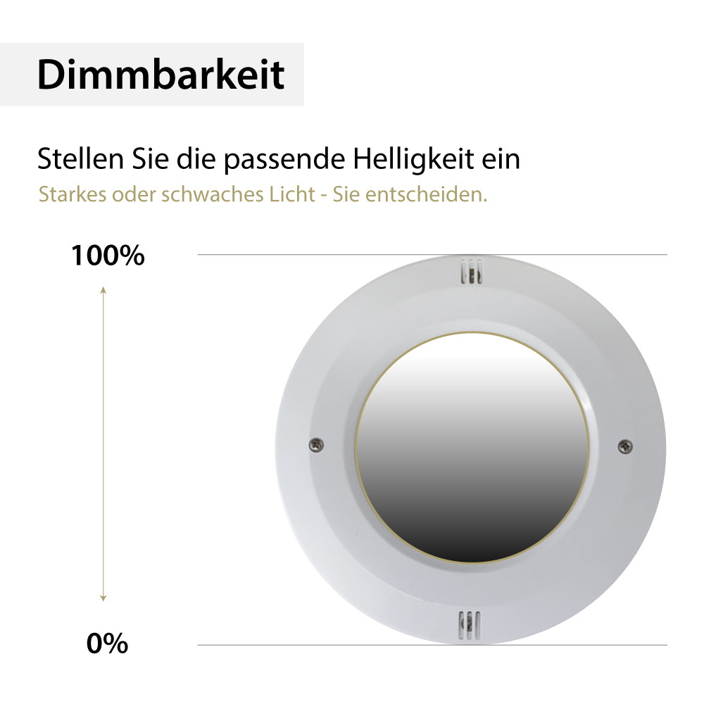 Flexibilität durch CCT, RGB und DimmbarkeitDank der Kombination aus CCT, RGB und Dimmbarkeit bieten unsere Poollampen ein völlig neues Niveau der Individualität. Sie können aus Millionen von Farben wählen und die Farbtemperatur von gemütlichem Warmweiß bis erfrischendem Kaltweiß regulieren. Die Helligkeit ist von 0 % bis 100 % dimmbar, sodass Sie die Beleuchtung ganz nach Ihren Wünschen anpassen können – ob für eine sanfte Atmosphäre bei ruhigen Abenden oder kräftiges Licht für eine lebendige Poolparty. Diese Kombination gibt Ihnen die volle Kontrolle über die Stimmung rund um Ihren Pool.