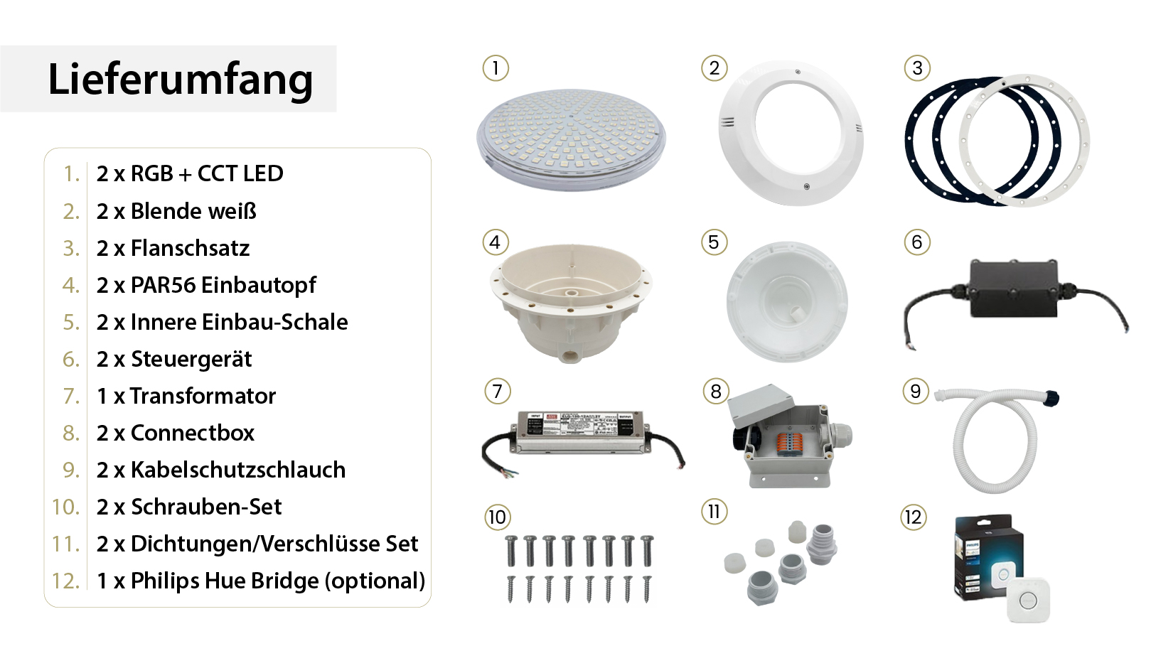 Haben Sie noch kein Smart Home System? Wir empfehlen Philips Hue!Die Philips Hue Bridge ist das zentrale Steuerelement des Systems und verbindet smarte Beleuchtung mit Ihrem Heimnetzwerk. Über die App steuern Sie sämtliche Funktionen ganz bequem. Die Bridge verwendet ZigBee für zuverlässige kabellose Verbindungen zu Ihren Poollampen und ermöglicht die Integration von bis zu 50 Geräten – auch bei komplexen Automatisierungen und Szenarien. Gerne können Sie die Philips Hue Bridge zusammen mit den Poollampen bei uns erwerben.