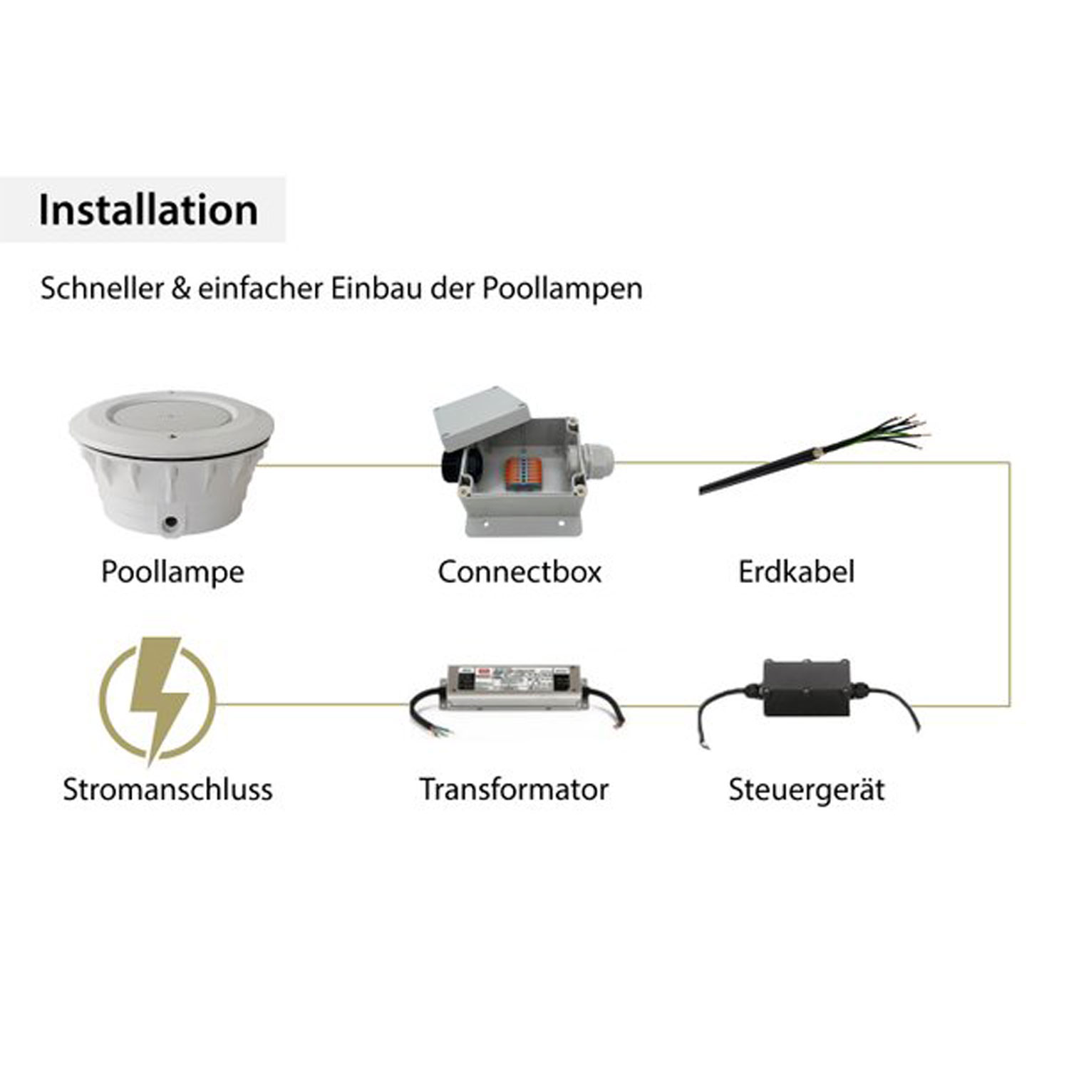 Installation der Smart Home PoollampenDie Poollampe ist mit einem 2 Meter langen Kabel ausgestattet, das einfach an die Connectbox angeschlossen wird. Die Kabel werden unkompliziert in die Haltevorrichtung der Connectbox gesteckt. Auf der anderen Seite der Connectbox schließen Sie ein Erdkabel an, das mit dem Steuergerät verbunden wird. Dieses kann bequem im Technikschacht, Technikhaus, Technikbox oder in der Garage installiert werden. Anschließend schließen Sie das Steuergerät per Netzteil (12V) an eine Steckdose an, sodass es die ZigBee-Signale des Smart Home Systems empfangen und an die Poollampe weiterleiten kann. Das Erdkabel muss in der Länge an den Abstand zwischen Poollampe und Steuergerät angepasst werden – passendes Erdkabel finden Sie ebenfalls bei uns.